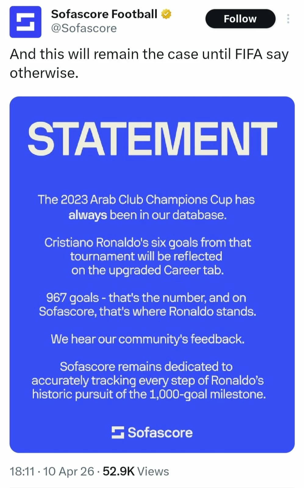 فبعد هجوم عشاق النجم البرتغالي على الموقع جراء ما تداولته حسابات عالمية وصحفيون حول حذف موقع الإحصاءات الأهداف الستة، وهو ما أشارت إليه «عكاظ» وقتها، تراجع الموقع وأعاد الأهداف الستة في سجل اللاعب التهديفي، قبل أن يُصدر بياناً إعلامياً عبر حسابه في «X»، بدأه بعبارة: «ويبقى هذا هو الحال إلى أن يقول الفيفا خلاف ذلك»، ومن ثم جاء ما يلي: «لطالما كانت بطولة كأس أبطال الأندية العربية 2023 موجودة في قاعدة بياناتنا، وستظهر الأهداف الستة التي سجلها كريستيانو رونالدو في تلك البطولة في علامة التبويب «المسيرة» بعد تحديثها، 967 هدفاً – هذا هو الرقم، وهذا هو رصيد رونالدو على موقعنا.