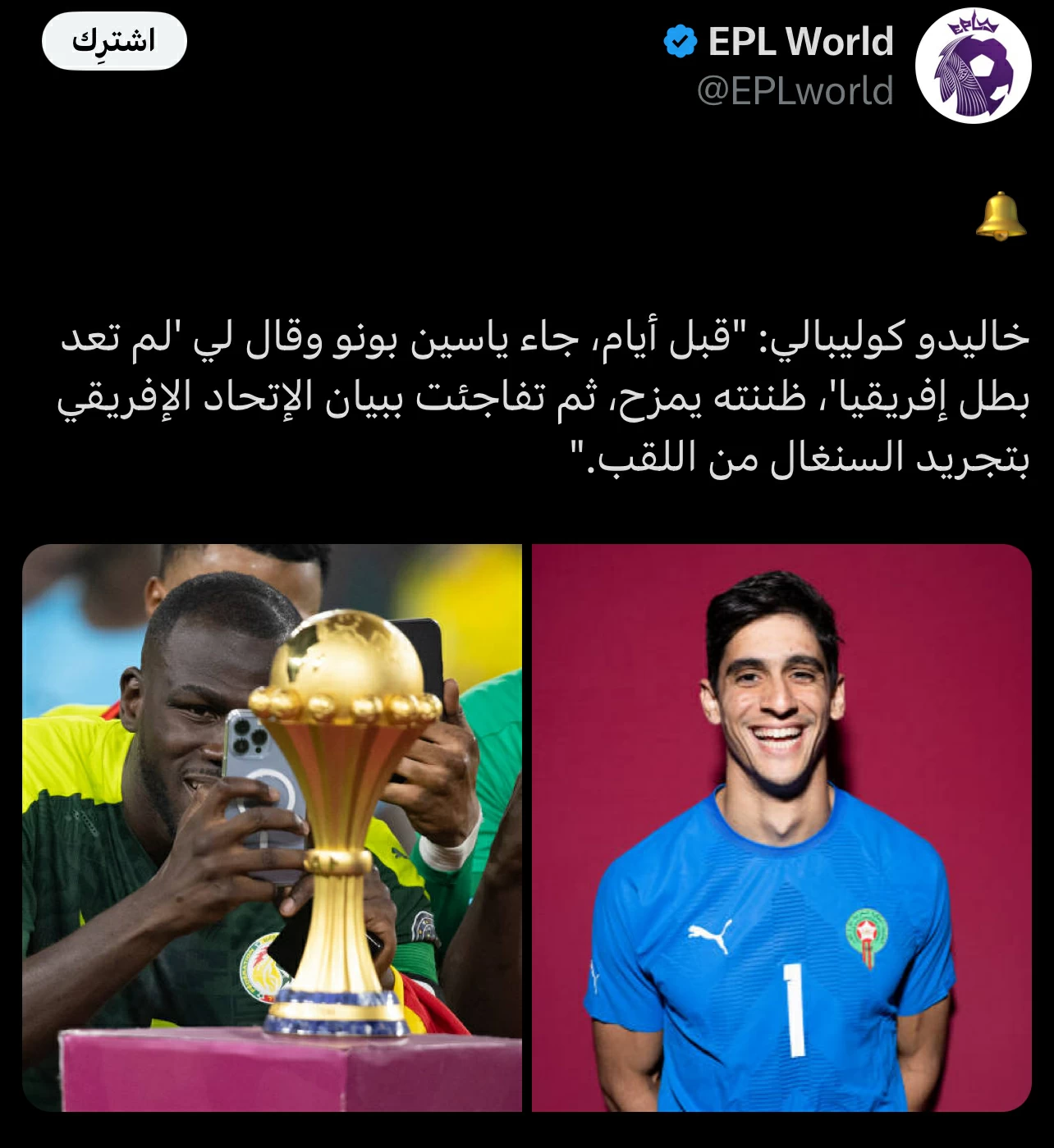 كشف قائد منتخب السنغال مدافع فريق الهلال السعودي خاليدو كوليبالي أن زميله ياسين بونو أخبره بقرار سحب كأس أمم أفريقيا بعد فوزه على المغرب بهدف في يناير الماضي قبل أن يصدر الـ«كاف» بيانه، وقال: «جاء ياسين بونو وقال لي لم تعد بطل أفريقيا، ظننته يمزح، ثم تفاجأت ببيان الاتحاد الأفريقي بتجريد السنغال من اللقب»، وفق ما كشفه كوليبالي لموقع «EPL World».
