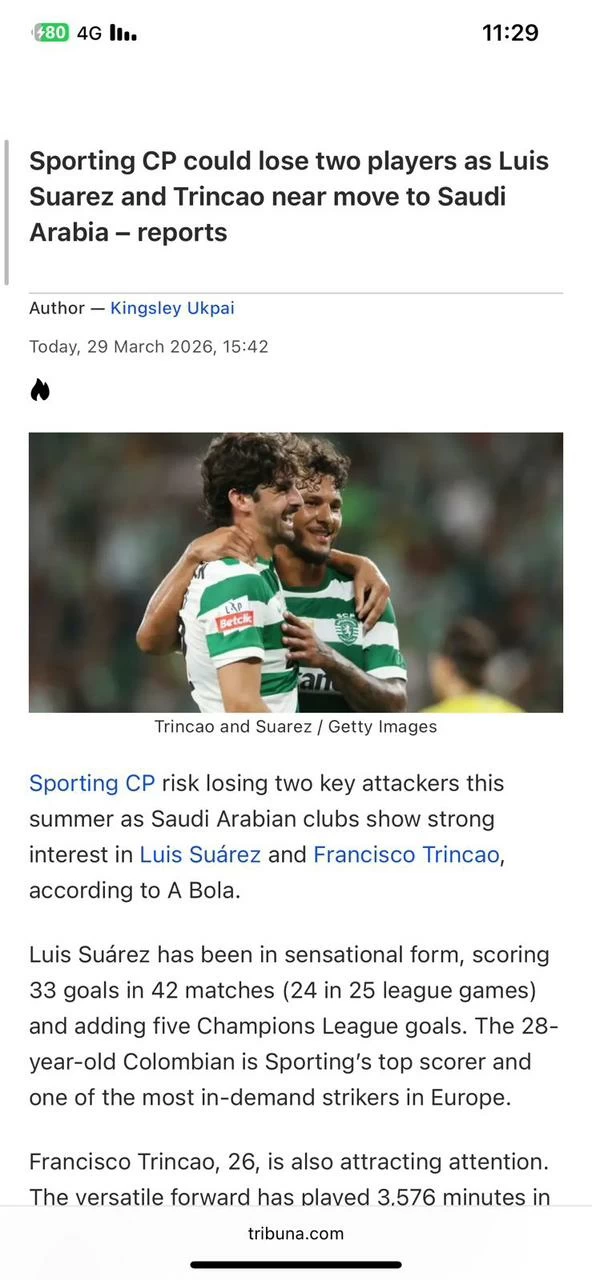هذا التحذير وجهته صحيفة «أبولا» البرتغالية إلى سبورتنغ لشبونة بعنوان «انتبه! سواريز وترينكاو في طريقهما إلى المملكة العربية السعودية»، إذ نال لويس خافيير سواريز وفرانشيسكو ترينكاو، اهتماماً كبيراً من قِبل أندية دوري روشن، التي تستعد لتقديم عروض مغرية في الصيف القادم، الأمر الذي يعيد ذكريات مؤلمة إلى بطل البرتغال ليست ببعيدة على الإطلاق.
