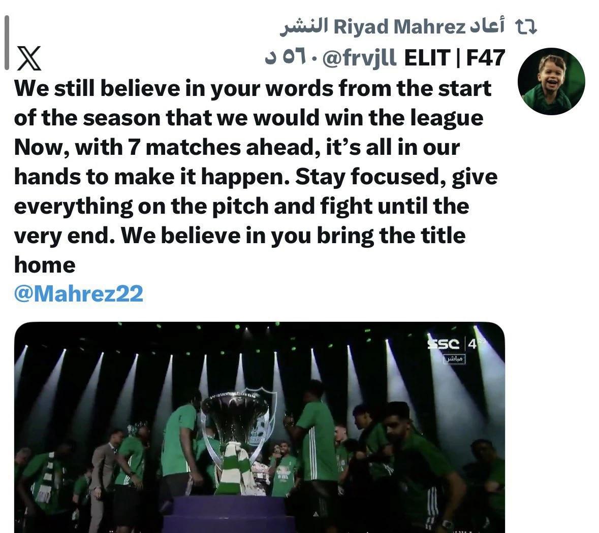 في رسالة تعكس ثقة الجماهير وطموح المرحلة الحاسمة، أعاد النجم الجزائري رياض محرز نشر تغريدة لأحد المشجعين طالبه فيها بالمضي قدماً نحو تحقيق لقب الدوري وإعادة أجواء الاحتفالات.
